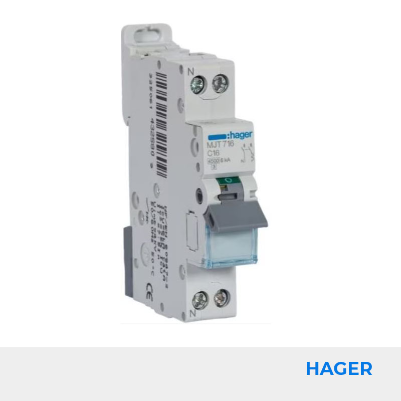 Les disjoncteurs bipolaires 1P+N Hager pour le domaine tertiaire de courbe C ont un pouvoir de coupure assigné de 4,5-6kA et se connectent par cage à vis.