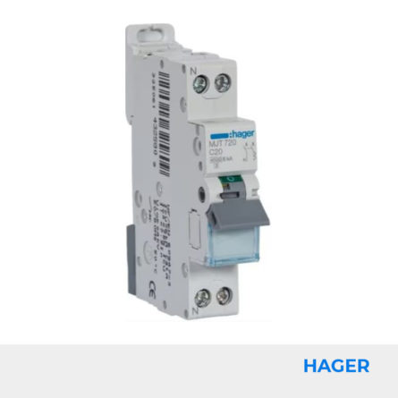 Les disjoncteurs bipolaires 1P+N Hager pour le domaine tertiaire de courbe C ont un pouvoir de coupure assigné de 4,5-6kA et se connectent par cage à vis.